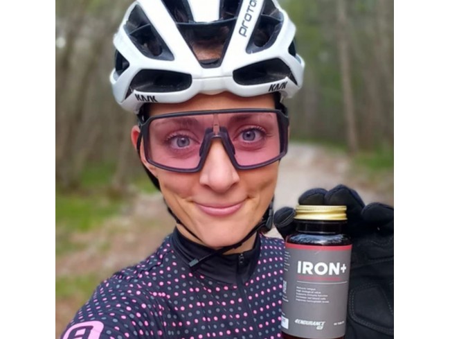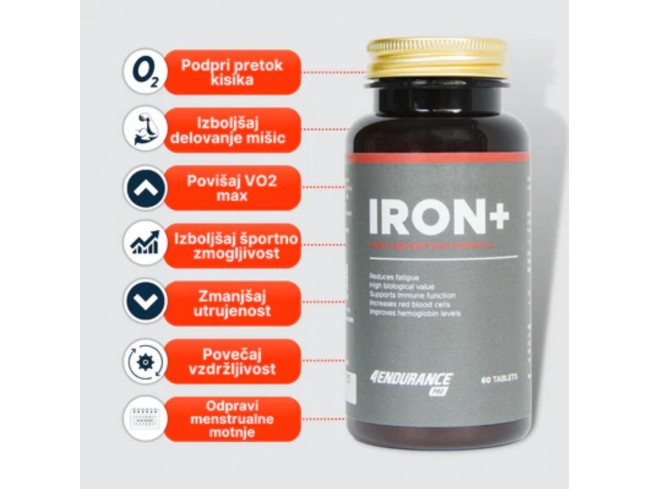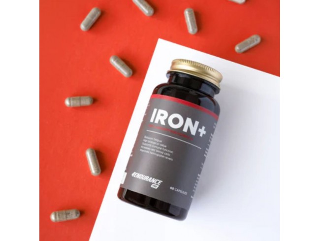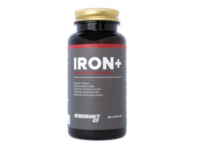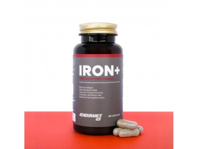 Železo+ iz linije 4Endurance Pro je odlično dopolnilo za športnike, saj spodbuja nastajanje rdečih krvničk, kar vodi do izboljšanega pretoka kisika in s tem tudi višjega VO2 max. Vsebuje 20 mg železovega bisglicinata na porcijo, vitamin C in izvleček listov maline. Ta kakovostna formula zmanjšuje utrujenost in podpira normalno delovanje možganov.