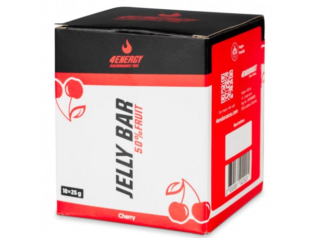 Jelly Bar 4Energy je okusna ploščica, bogata z ogljikovimi hidrati, ki zagotavlja hiter vir energije brez prebavnih težav. Vsebuje 50 % pravega sadja (fruktoze) in glukoze, kar zagotavlja naravni vir energije z visoko stopnjo absorpcije, tudi med intenzivno vadbo.