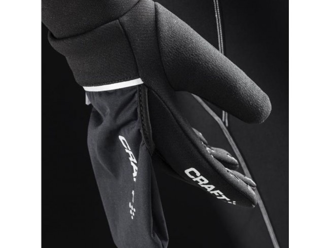 Tople, športne rokavice CRAFT Hybrid Weather so večnamenske rokavice, primerne za intenzivnejše športne aktivnosti na prostem, kolesarstvo in tek na smučeh. Odlikuje jih vodoodporna, protivetrna, prilagodljiva "kapuca" oz. pokrivalo z VENTAIR X Wind tkanino, s katerim po želji prekrijete prste in jim tako zagotovite dodatno izolacijo in toploto. Krtačena notranjost za dodatno toploto in udobje. Narejene so iz elastične, funkcionalne tkanine, ki se hitro suši, imajo silikonski potisk na dlani za boljši oprijem (palice ali balanca) in so združljive z zaslonom na dotik. Iz recikliranih materialov. Pokrivalo v odsevni barvi.